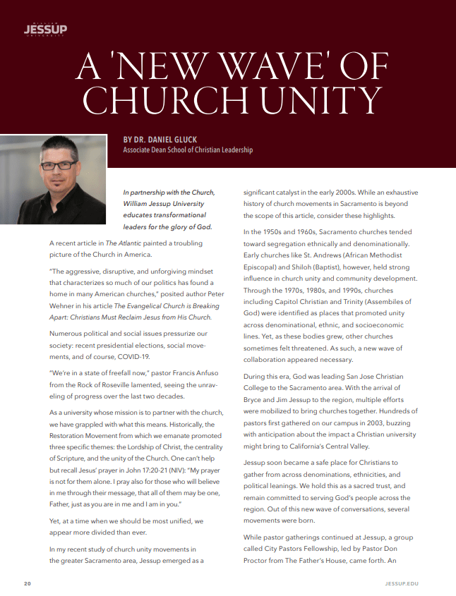 “A New Wave of Church Unity.” Article in Jessup Magazine (Feb 2022). Rocklin, CA.